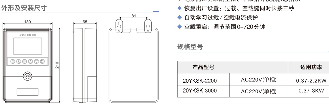 本机采用原装进口微电脑单片机技术,针对水泵被卡死堵转、生锈、过载、空转时的异常情况进行快速停机保护。
